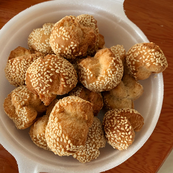 [밀가루300g, 계란, 베이킹파우더3g, 식용유10g, 설탕100g, 참깨, 물50g]