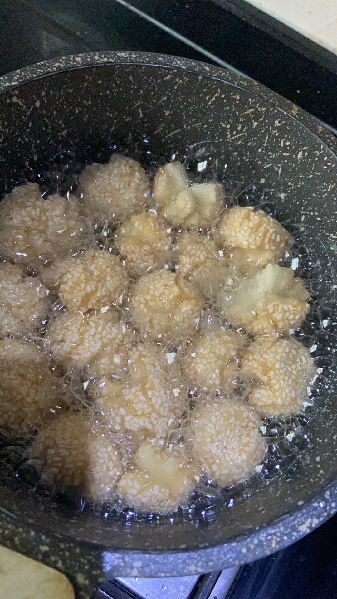 기름을 불위에 올려주시고~ 달아오르기 시작하면 약불로 바꿔주세요. 이제 참깨볼 넣어주시면 됩니다.