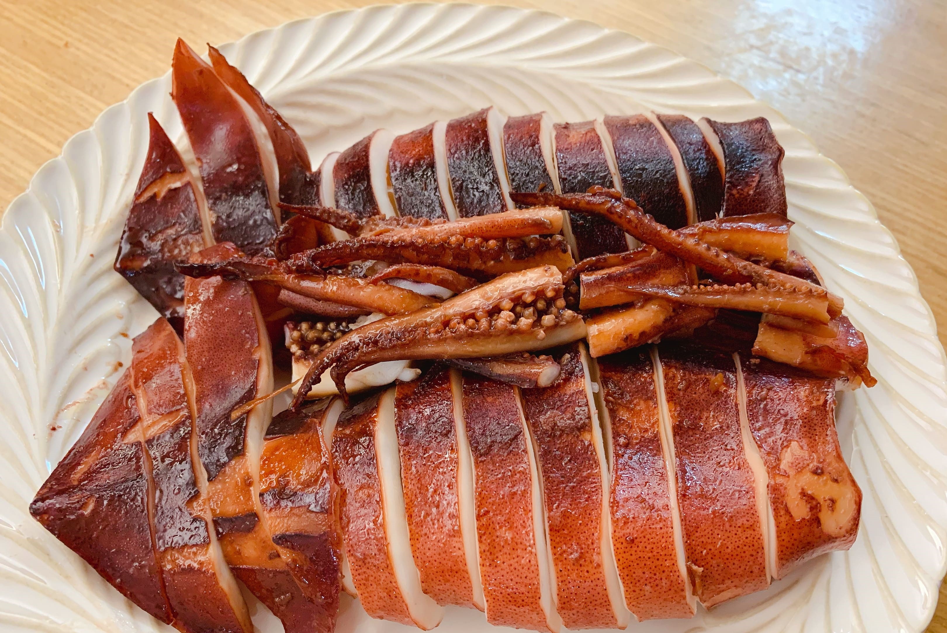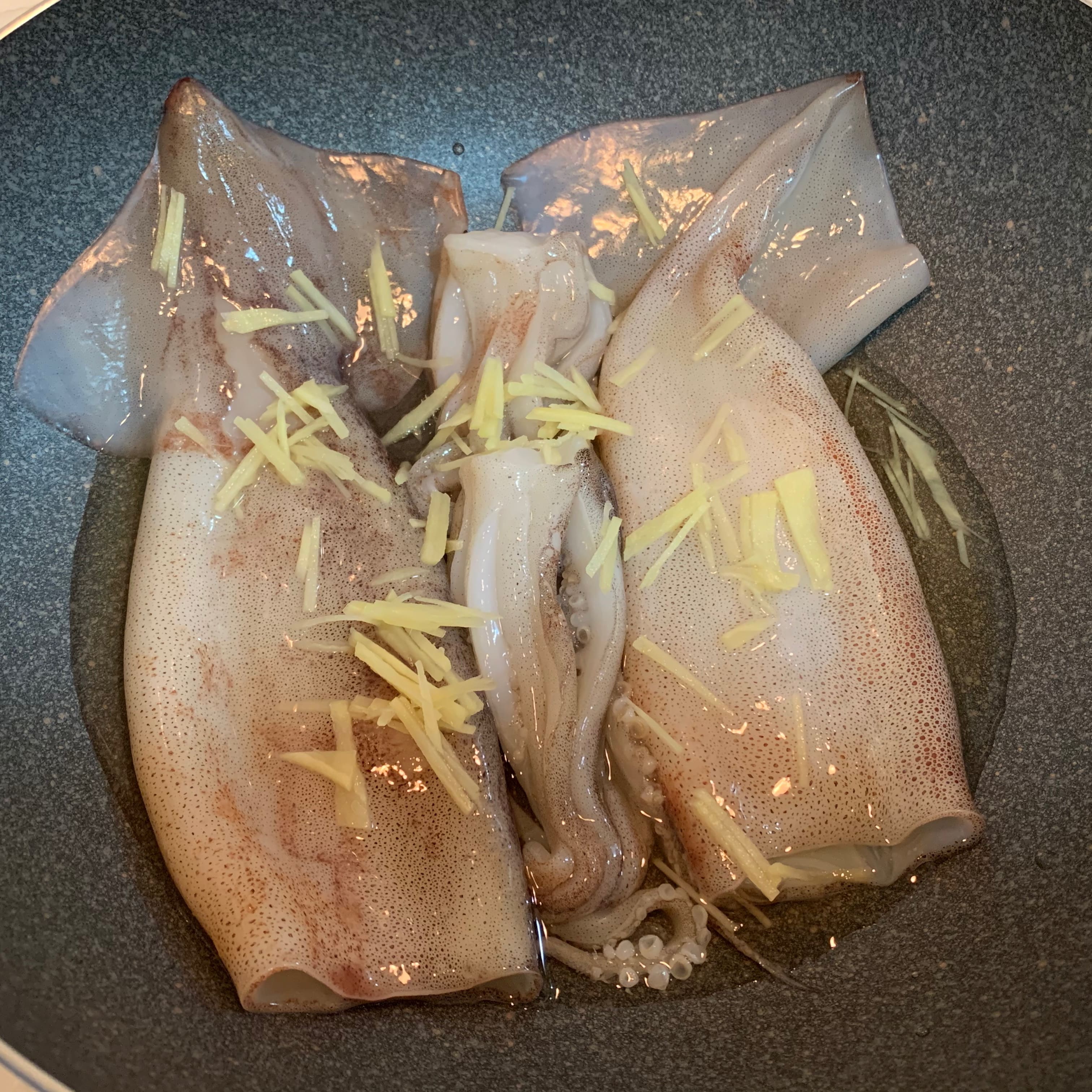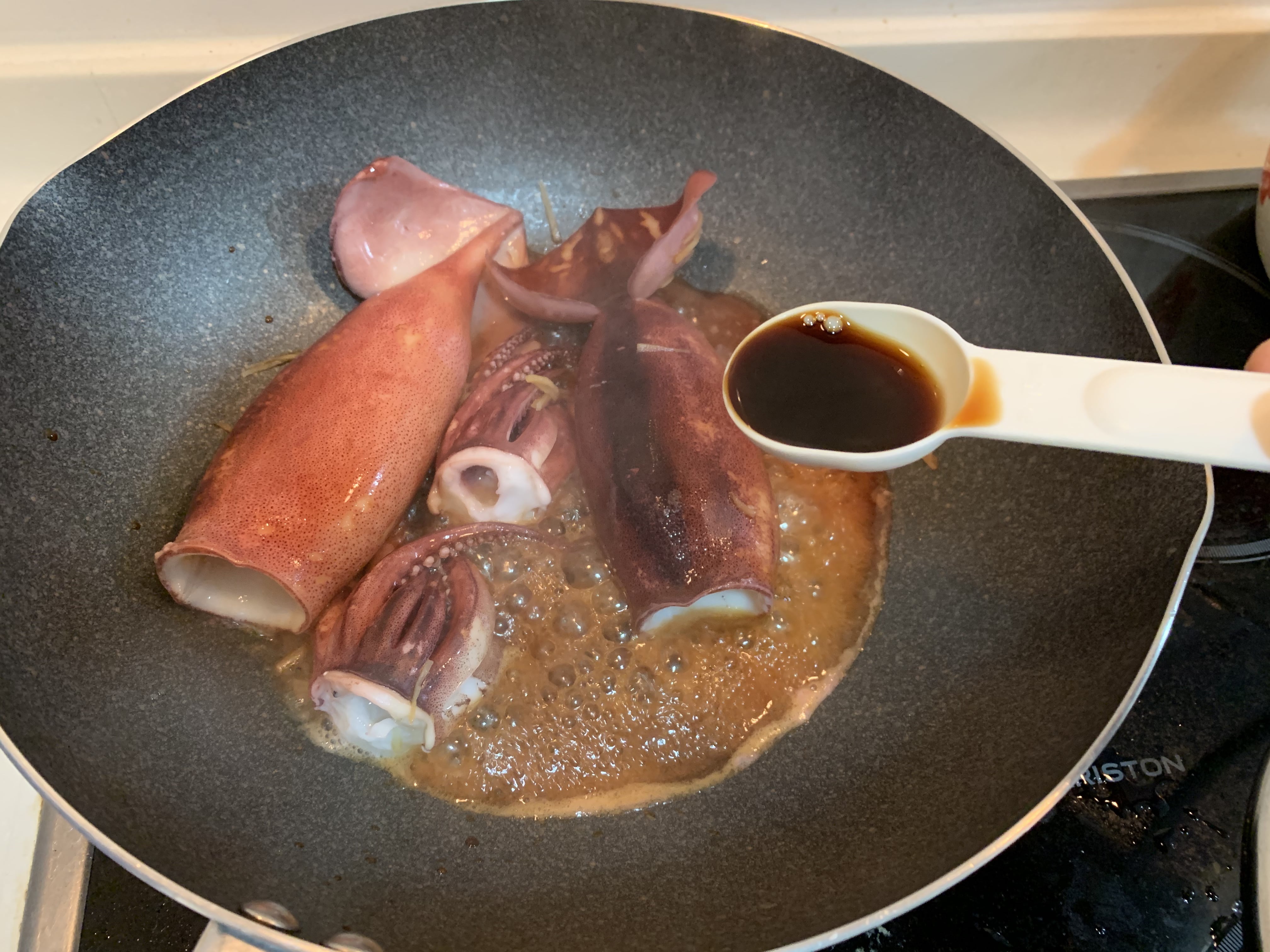 [오징어 2마리, 미림 1큰술, 소주, 2큰술, 버터 15g, 간장 3큰술, 생강]